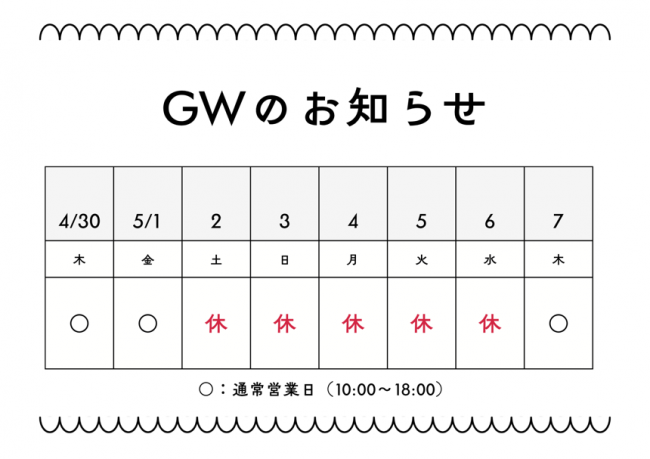 さて、ゴールデンウィークの休業について、以下の通りご案内いたします。